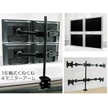 | ↑サンコーの『16軸式くねくね4モニターアーム』。23インチ級の液晶でも4台付けられるとの情報をネットで見つけ、2台貸し出してもらいました。なお、足りない5台は自腹で購入しました。6万円ぐらいの手痛い出費ですが、これも実験のため。あとで設置の手伝いを拒否したハッチに3台ぐらい売りつけてやろうと思ってます。 |