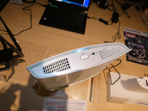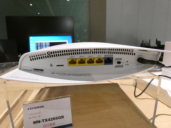 ルーターとしては、トライバンドルーター「WN-TX4266GR」が参考展示してあった。2つの5GHz帯と1つの2.4GHz帯の3つのバンドに分散することで混雑を解消できるのが特徴。5GHz(W56)は最大1733Mbps、5GHz(W52/W53)は最大1733Mbps、2.4GHzは最大800Mbpsでの通信が可能だ。排熱のためにサイズは大きめだが、部屋に馴染むようにヘアライン加工が施してあるほか、有線LANケーブルなどは筐体下に接続して1ヵ所から出すため、スッキリとさせられるのも魅力だ。2月下旬に出荷予定で価格は1万8700円(税別)を予定している。