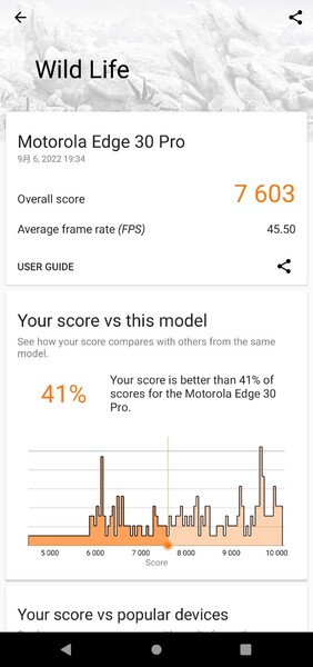 3DMark「Wild Life」スコアは「7603」とかなり良好な結果に(1万でMAX扱い)。平均fpsは45.50で、悪くない結果と言えるだろう。