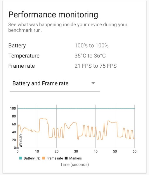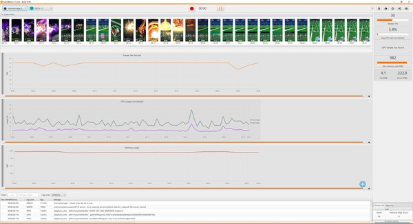 スマホゲームのフレームレート(fps)が計測できるアプリ「GameBench」で計測したところ、ほぼ常に30fps(上限)が出ているのがわかる。戦闘への入りと終わり時に一瞬だけ落ちるものの、フィールドに復帰すればすぐに戻っていた。