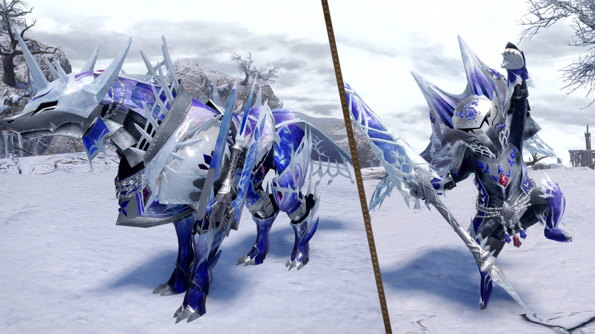 プレゼントする【追加ガルク重ね着装備】は、「なりきり冰龍シリーズ」。オトモガルクに装備させることで、無料タイトルアップデート第4弾で登場する「イヴェルカーナ」になりきることができる。