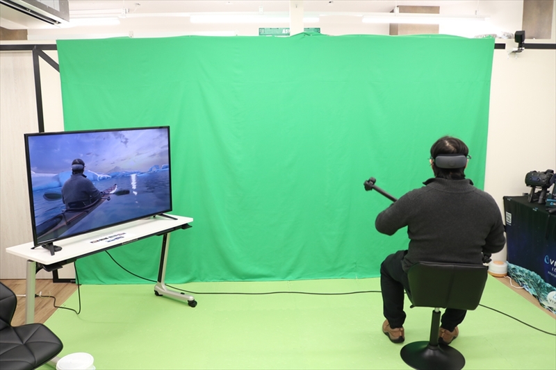 今回は『Kayak VR: Mirage』を体験。氷に覆われたバーチャル空間で、カヤックを操縦するVRゲームだが、4K高画質で非常に美しい映像が楽しめた。同社では、棒の左右にリストトラッカーを取り付け、それをカヤックのオールとしてリアルな体験を行なった。