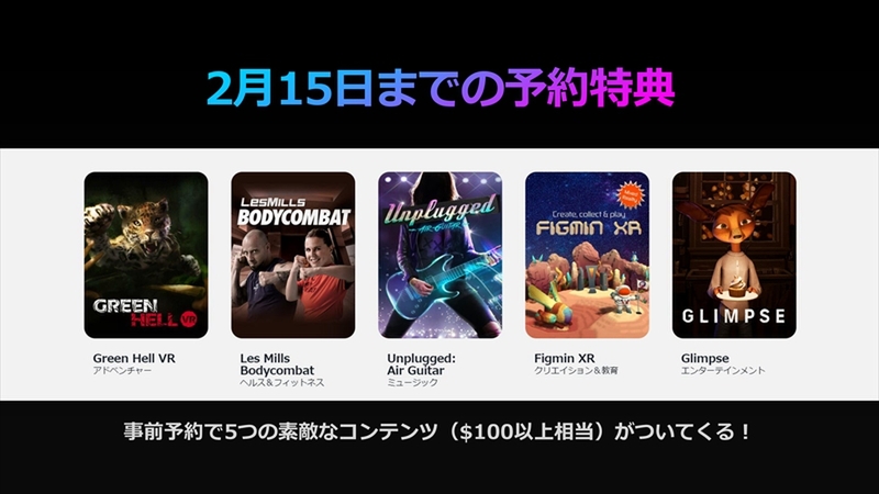 ちなみに、VIVE XR Eliteは2023年2月15日までに事前予約を完了し、2023年3月31日より前にセットアップを完了すると5つのVRゲーム『Gree Hell VR』やヘルス&フィットネス『Les Mills Bodycombat』など、100ドル相である5つのコンテンツが無料でプレゼントされる。