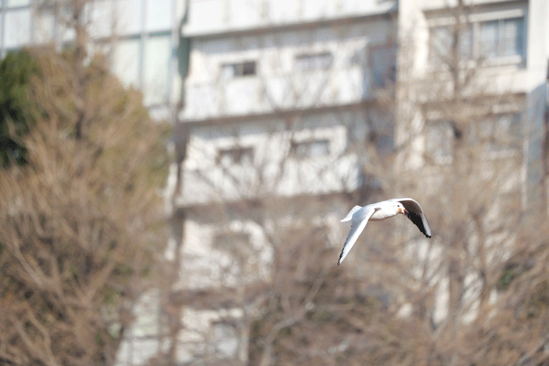 秒30コマ連写で飛んでいる鳥を撮影した写真からGIFアニメを作成。距離があって被写体が小さめなのはお許しを。使用レンズ「LUMIX S 70-300mm F4.5-5.6」・絞りF5.6・シャッタースピード1/3200秒・ISO1600。