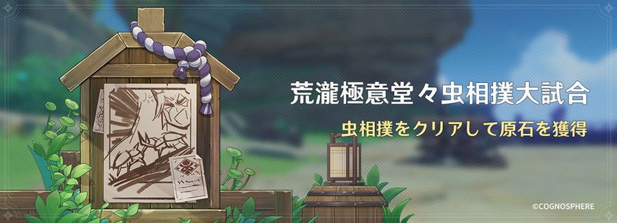 2023年2月16日より、イベント「荒瀧極意堂々虫相撲大試合」を開催予定。イベント期間中、全5つの虫相撲挑戦をクリアすると、原石、大英雄の経験、天賦育成素材、仕上げ用魔鉱、モラなどの報酬を獲得できる。
