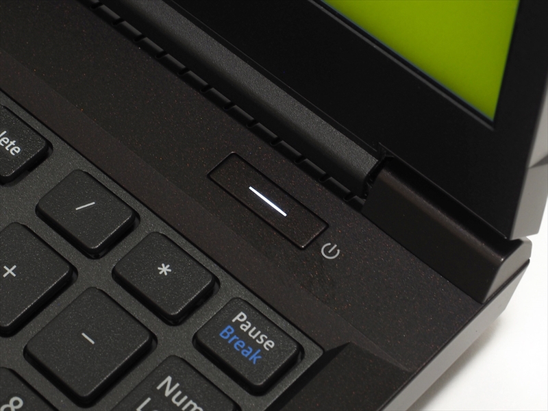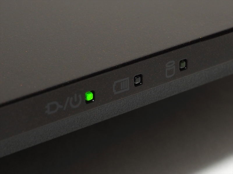 タッチパッドもけっこう手前まで使って十分な大きさを確保している。タッチパッドが大きいと細かな操作もしやすい。ほかにもホームユース向けと感じられるのが、独立した電源ボタンと前面右端にある各種インジケータ。最近、電源ボタンをキーボードと同じ列に置くモデルもあるが、キーが1つ電源に置き換わるといったデメリットがある。また、インジケータは電源、充電、ディスクアクセスと、一般的な3つの情報を分かりやすく教えてくれる。