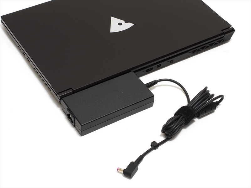 ACアダプタ用ジャックは背面。高性能で消費電力も大きめのCore i7、さらにはディスクリートGPUも搭載するため出力は120Wだ。出力のわりにやや大きいが、主に床置き、足元に置くような運用になると思われるので影響は小さいだろう。