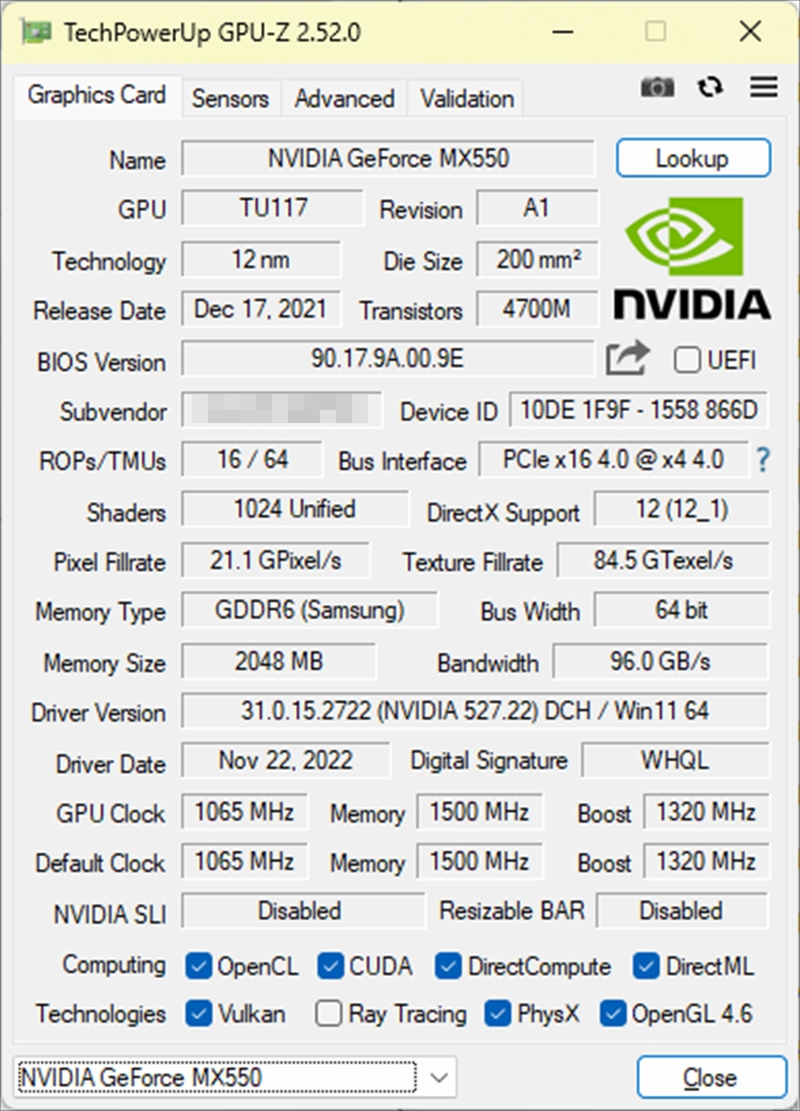 GPUの世代としてはTuring。MX550のコアはTU117、つまりGeForce GTX 1650でも用いられているものだが、メモリバス幅が128bitから64bitに削減され、都合、ROPsも半分、そしてメモリ搭載量も半分といったスペックだ。