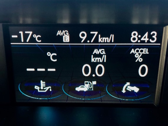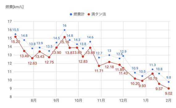 納車から約半年で9054kmを走って、満タン法での平均燃費は12.40km/L。ただ昨年末から9km/L台が続いておりまして、悪化が続いています。転がり抵抗の大きなスタッドレスタイヤを履き、走行抵抗の大きな積雪路を走っていることも理由ですが、寒くて暖機に時間を要するのが一番の要因です。