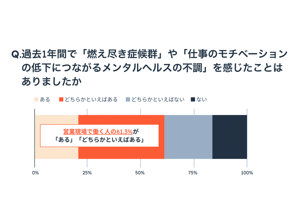 一方、営業組織における社員教育やマネジメント面の課題として、「従業員のモチベーション維持」が45.0%と、2位を大きく引き離して、トップとなったものの、営業責任者および担当者の61.3%が、過去1年で燃え尽き症候群や、仕事のモチベーション低下につながるメンタルヘルスの不調を感じたと回答していることもわかった。
