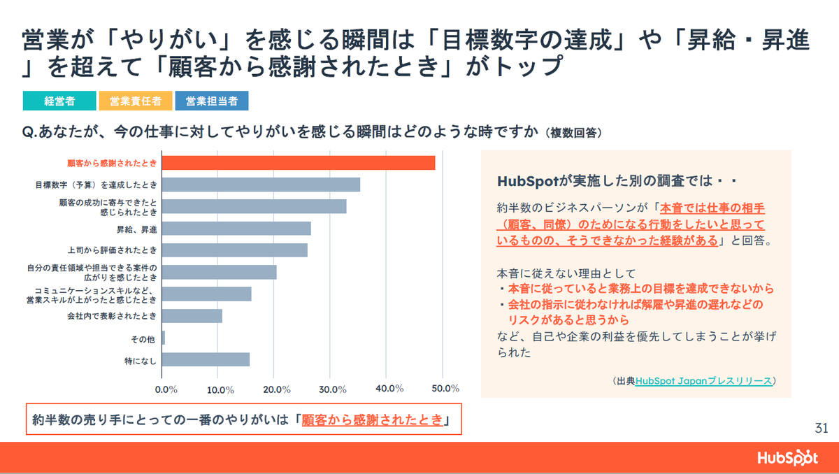 営業職がやりがいを感じる瞬間としては、「顧客から感謝されたとき」が首位となり、次いで、「目標数字(予算)の達成したとき」、「顧客の成功に寄与できたと感じられたとき」、「昇給・昇進」の順となった。
