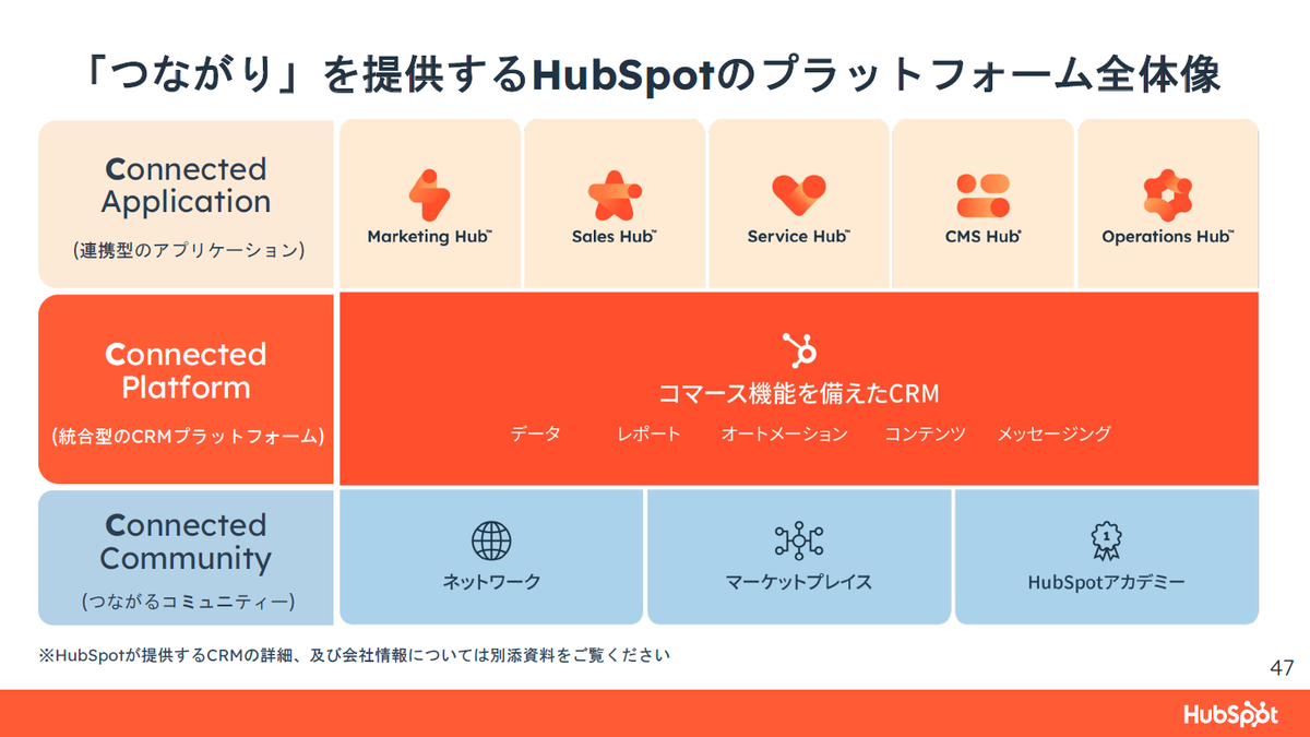 廣田カントリーマネージャーは、「企業は、データとシステムの分断、企業と顧客の分断、人と人との分断という3つの課題に直面している。これらを解決するにはつながりの力が必要であり、従来のCustomer Relationship Management(CRM)による顧客の管理ではなく、顧客とのつながりを創出するCustomer Connectionを提供できるプラットフォームが必要である」と指摘。「HubSpotでは、Marketing Hubをはじめとした5つのプロダクト群で構成する連携型アプリケーションのConnected Application、顧客情報の管理だけでなく、レポートや分析機能により顧客の課題を抽出し、カスタマージャーニーを提案する統合型CRMプラットフォームのConnected Platform、ビジネスのヒントを共有したり、新たな学びの支援などを実現したりする、つながるコミュニティとしてのConnected Communityを提供し、組織内、顧客と企業、企業を超えたつながりをもたらす製品とサービスを提供している」と述べた。