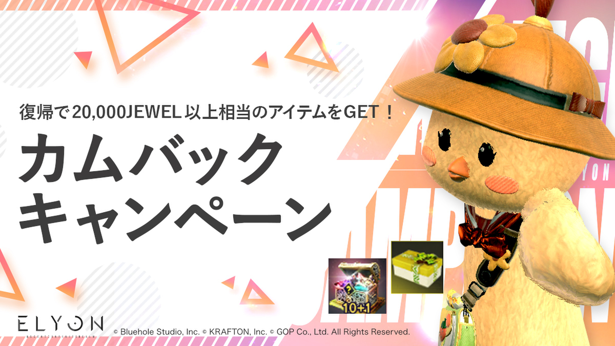 G・O・Pは2月15日、同社が運営するPC向けMMORPG『ELYON』(以下、エリオン)にて、「ウェルカムバックキャンペーン」を開催した。期間は、2023年3月15日メンテナンス前まで。