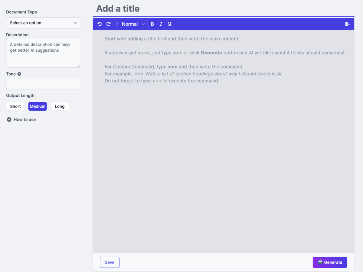 もちろんただのテキストエディターと異なりAIが手助けをしてくれる。具体的には文中で書くことに詰まったときに「Generate」ボタンをクリックすると、自動的に続きを書いてくれるのだ。