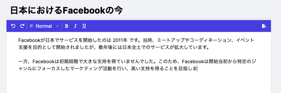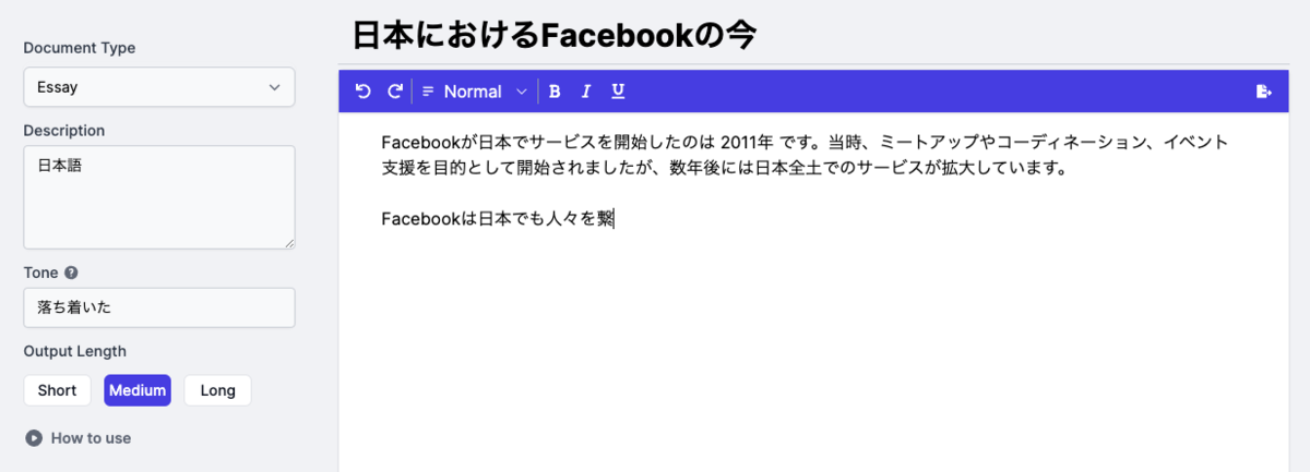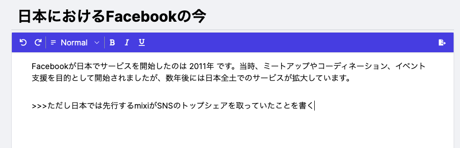 また、「>>>」と入力した後に書きたい内容を記すと、AIがその内容を推測して書いてくれる機能もある。ここでは「ただし日本では先行するmixiがトップシェアを取っていたことを書く」と記入して「Generate」ボタンを押してみた。