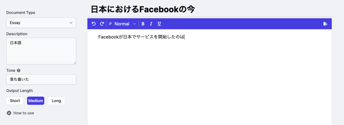 例えばFacebookについてのコラムを書いてみることにする。タイトルを決め、1行目に「Facebookが日本でサービスを開始したのは」と書き始めた。「そういえばFacebookの日本進出っていつだっけ?」と困ったところでさっそく「Generate」ボタンをクリック。