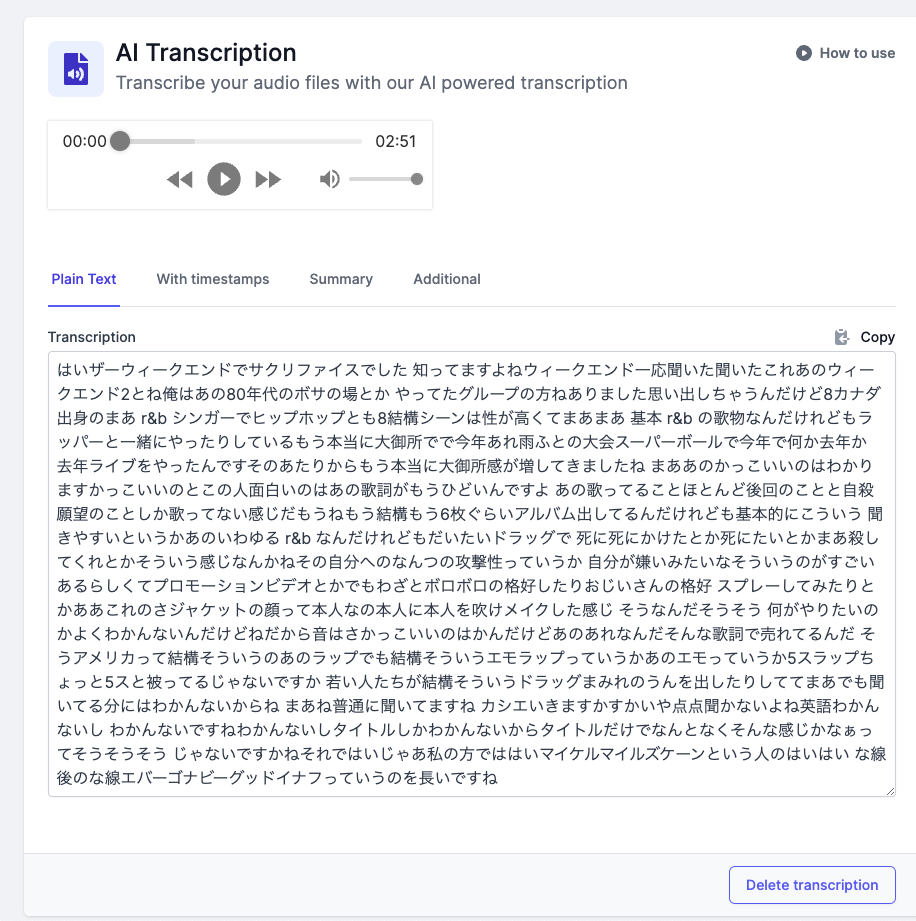 録音データには「あぁ」、「えっと」のような意味をもたない音も多く、他の書き起こしツールではノイズになることが多いのだが、おそらくGPT3モデルを利用することでノイズ要素を削除しているのだろう。もちろん英語のファイルなら精度は遥かに高くなる。