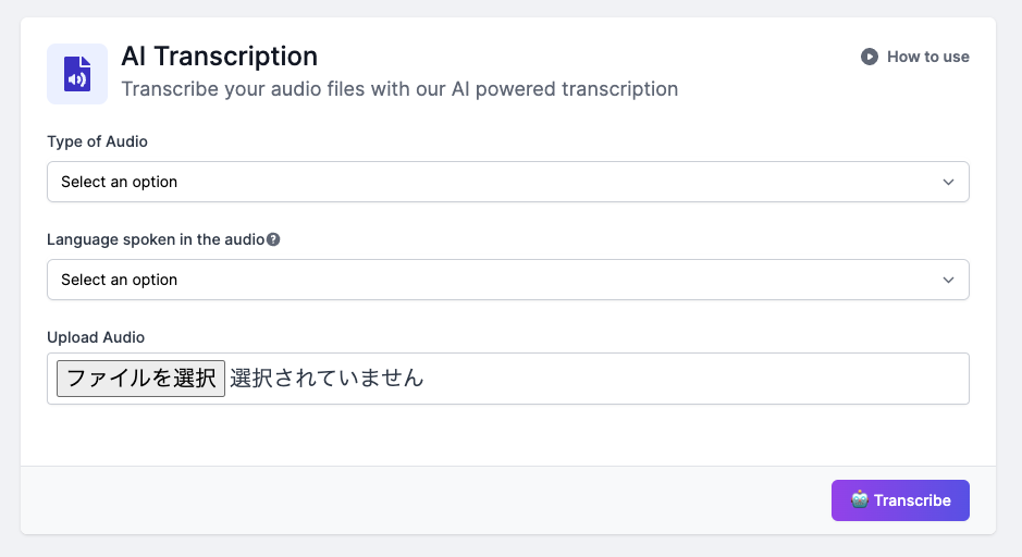 使い方は簡単。「ファイルを選択」をクリックして音声ファイルを読み込ませたら「Transcribe」ボタンを押せばいい。