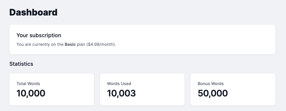筆者は月10ドルのBasicプランに入ってみたが、1万ワードは1週間ほどで使い切ってしまった。とは言えボーナスワードを5万ももらっているのでなんとか翌月までもちそうではある。