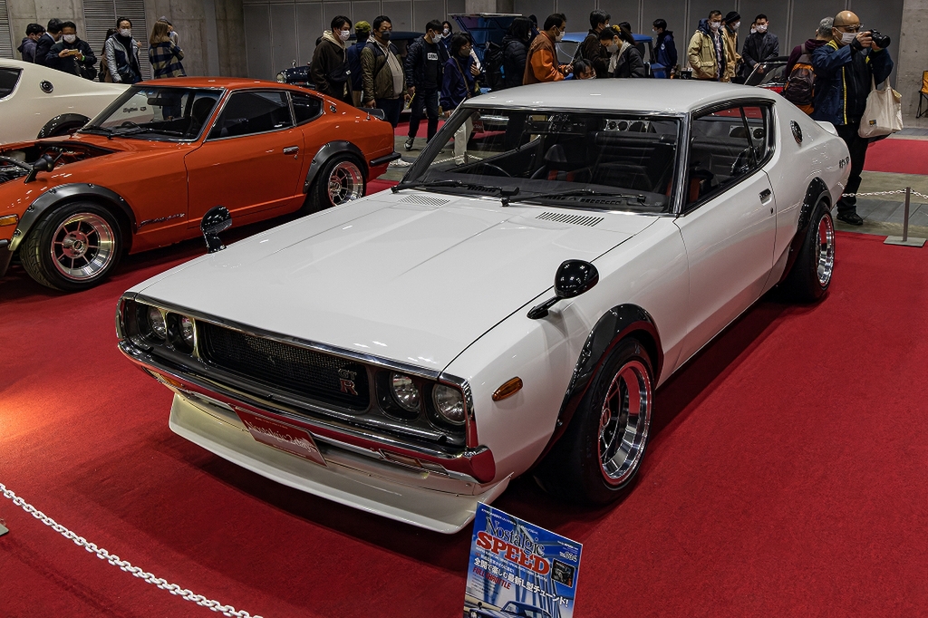 スカイラインHT 2000 GT-X(KGC110)。一見「ケンメリ?」(KPGC110)に思ったのですが、よく見ると違うようです。フロントリップスポイラーやオーバーフェンダーが当時の街道レーサーな感じがして実に◎。