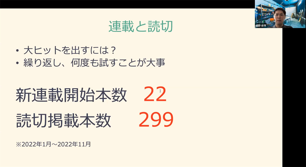 では、なぜ試行回数を増やすのかと言えば……我々はさまざまなノウハウも持ってはいるのですが、結局のところ、繰り返し何度も試すことが重要だからです。具体的にどれくらい試しているのかと言うと、「少年ジャンプ+」の場合、2022年1月から11月までに新連載を22本始めています。そして、読切は299本載せています。