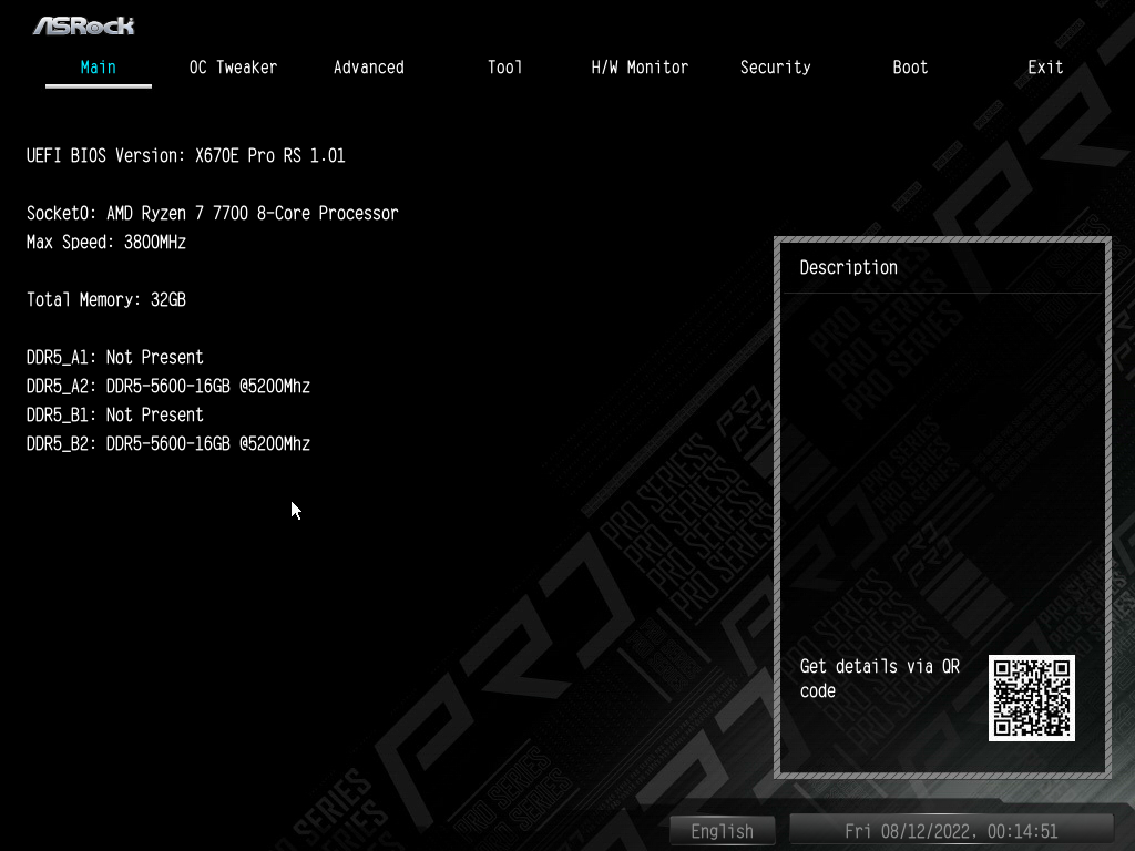 続いてAMD環境だ。同じDDR5メモリーモジュール「Crucial 16GB DDR5-5600 UDIMM」を使用し、マザーボードはASRockの「X670E PRO RS」、CPUはAMD「Ryzen 7 7700」で試している。