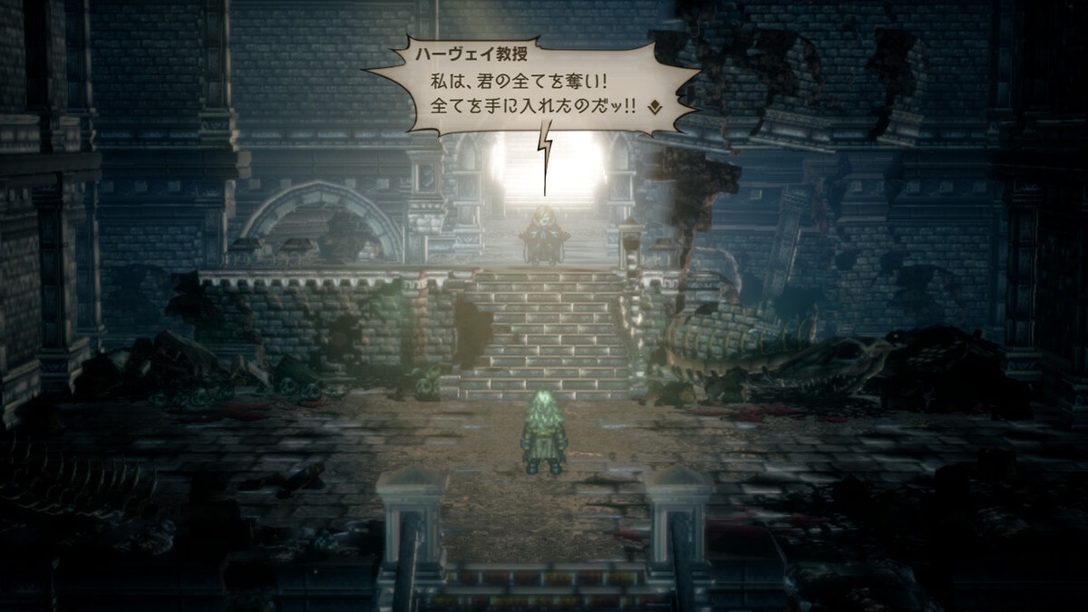 本作を語るうえでまず外せないのが「物語」だ。剣士「ヒカリ」、踊子「アグネア」、商人「パルテティオ」、学者「オズバルド」、盗賊「ソローネ」、神官「テメノス」、狩人「オーシュット」、薬師「キャスティ」の8人から、プレイヤーは最初の主人公を1人選択する。