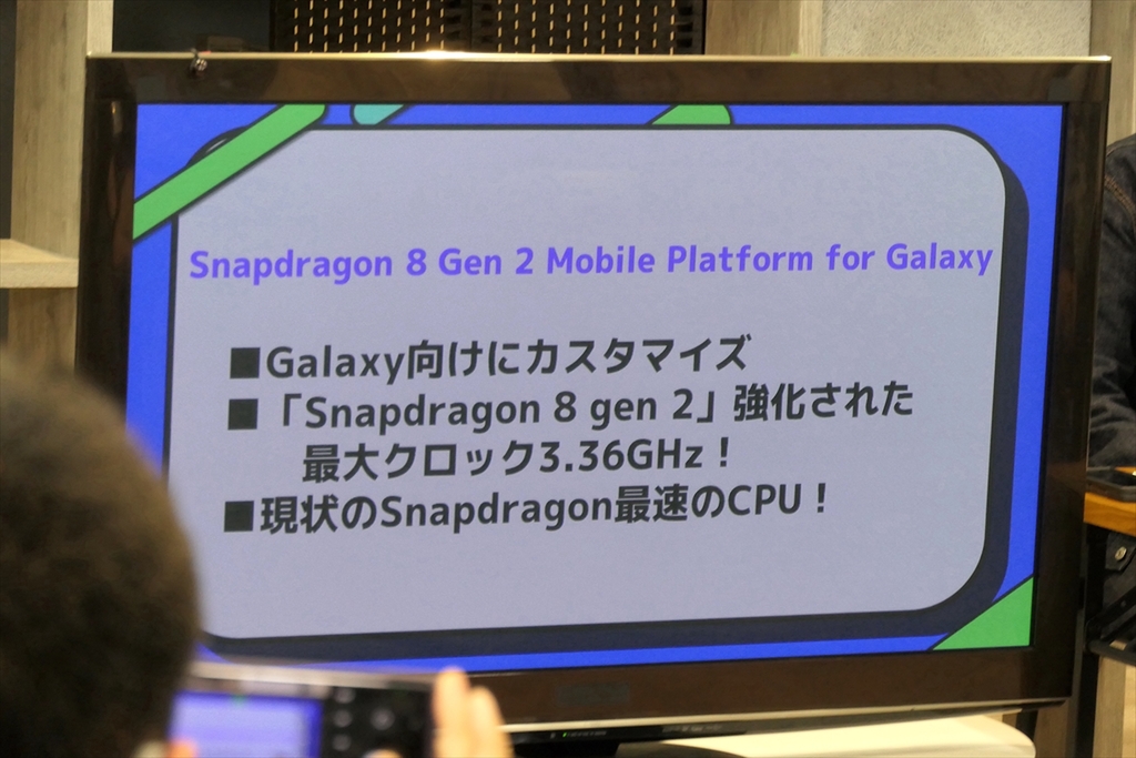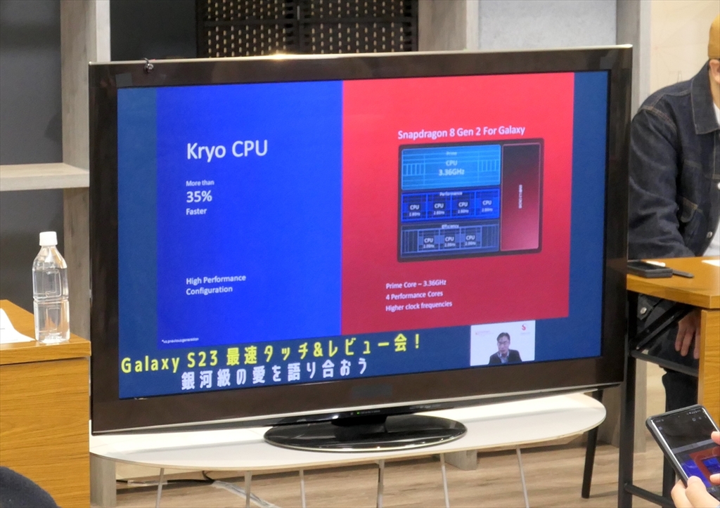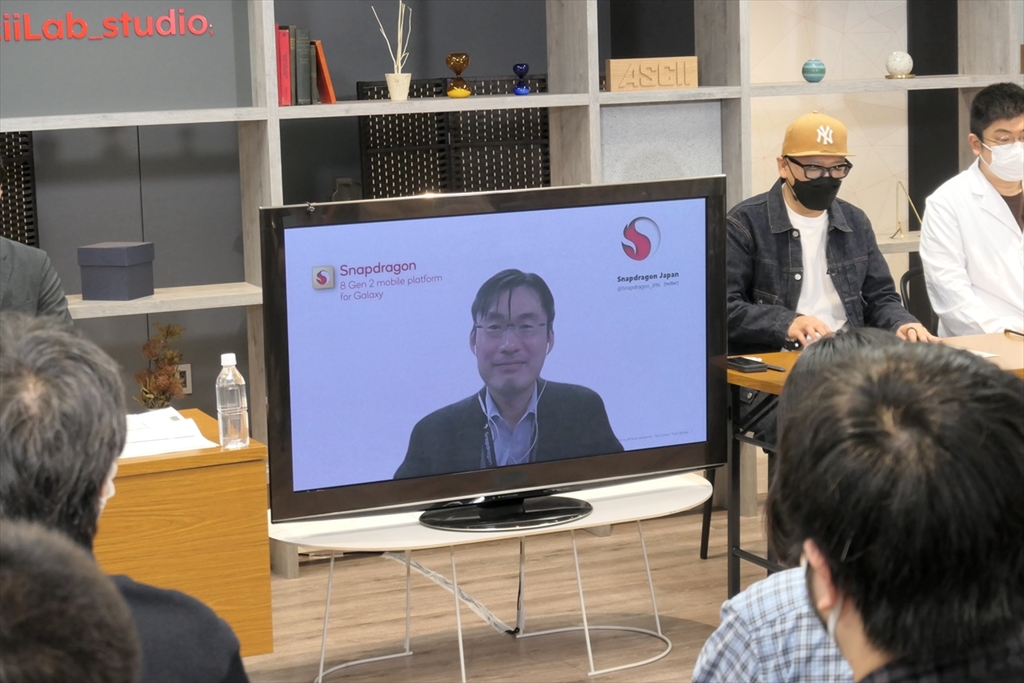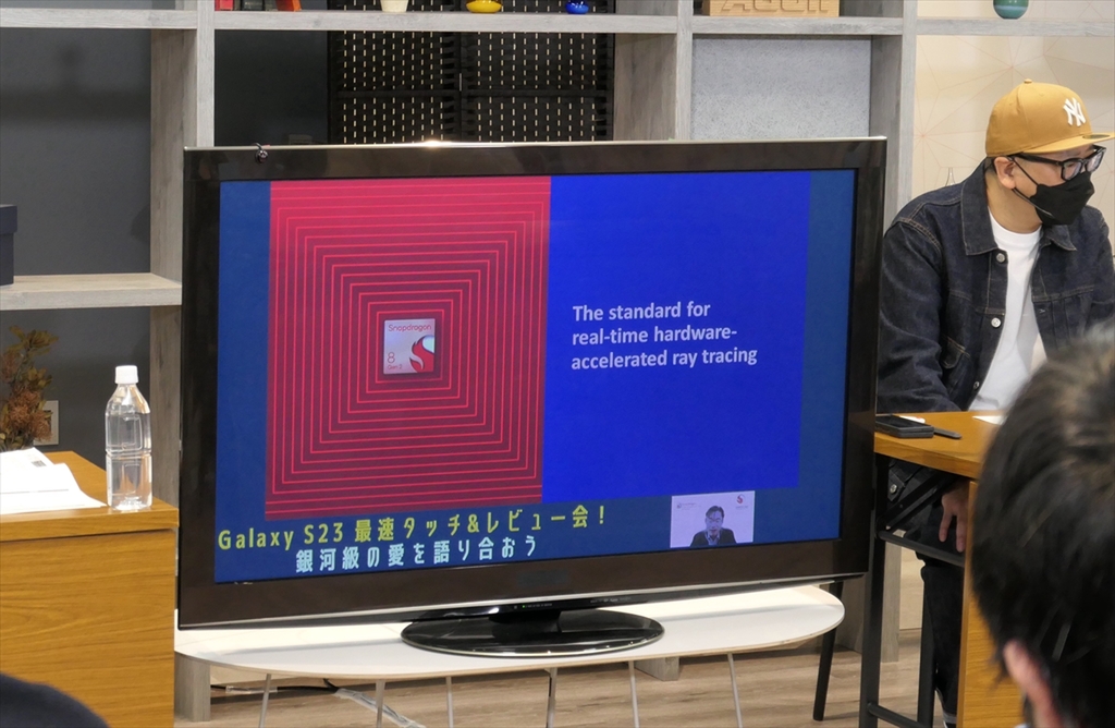 ここで、会場に設置されたモニターに、スペシャルゲストが登場。クアルコム ジャパン 業務推進部 部長の福井幹浩さんがオンラインで出演し、Snapdragon 8 Gen 2 Mobile Platform for Galaxyについて、わかりやすく説明してくれました。