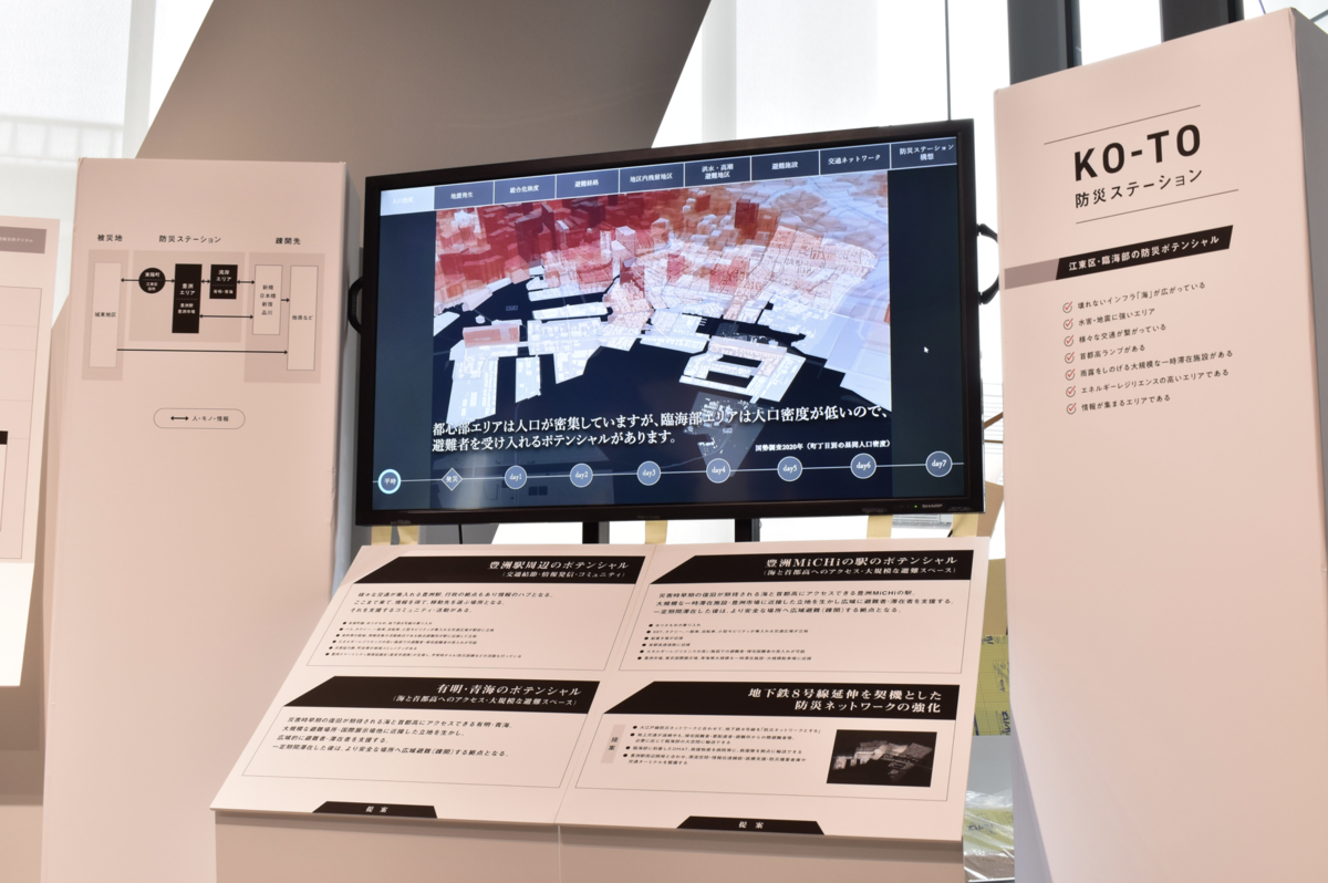 「交通防災展示」は、國學院大學の専任講師・児玉千絵先生がメインで監修。臨海部が高台構造になっていることなどから災害に強いことを「KO-TO防災ステーション構想」として提案。さらに災害が起きてから1日後、3日後、1週間、1ヵ月と経過した場合の状況を「タイムライン」として整理してパネルで展示した。