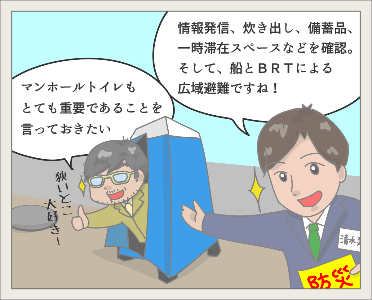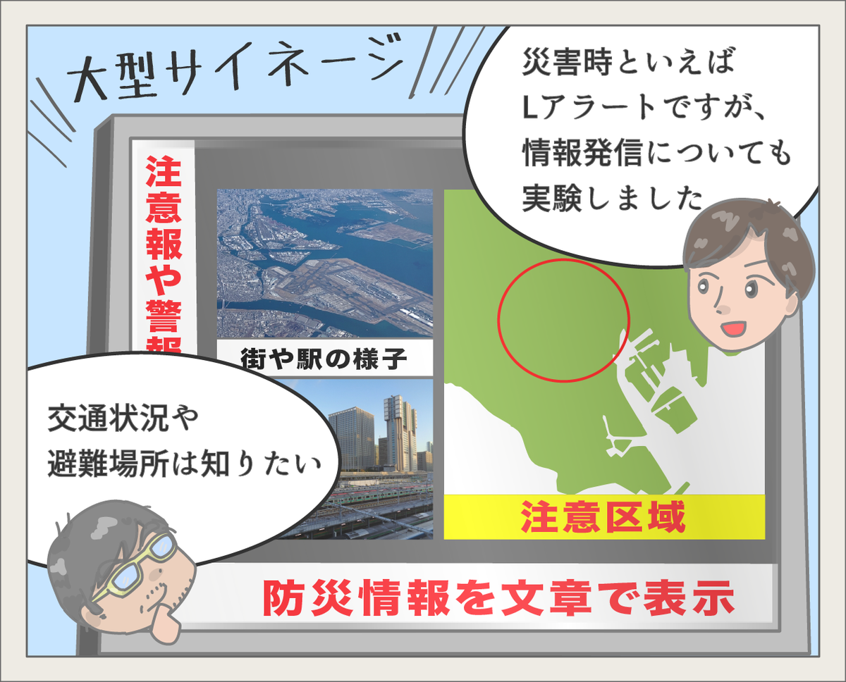 さらに大型サイネージにはLアラートの情報を投映。直接下水道につながる「マンホールトイレ」など施設の機能を紹介し、最後には船と連節バスを使ったバス高速輸送システム「BRT」で広域避難の訓練をした。