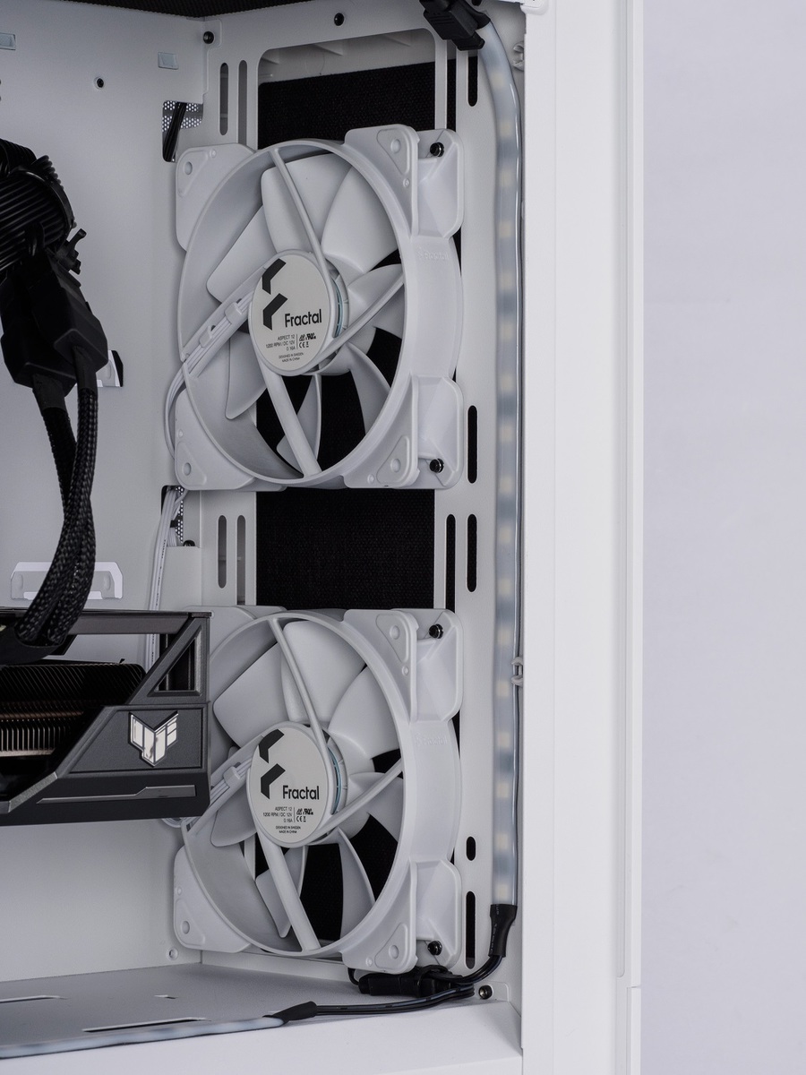 取り込んだ冷たい外気は、直接CPUクーラーとビデオカードに当たるよう位置が調整されており、少しでも効率良く冷やせるよう考えられている。これらのファンも裏配線が徹底されており、PCケース内に余分なケーブルが見えないようになっている。