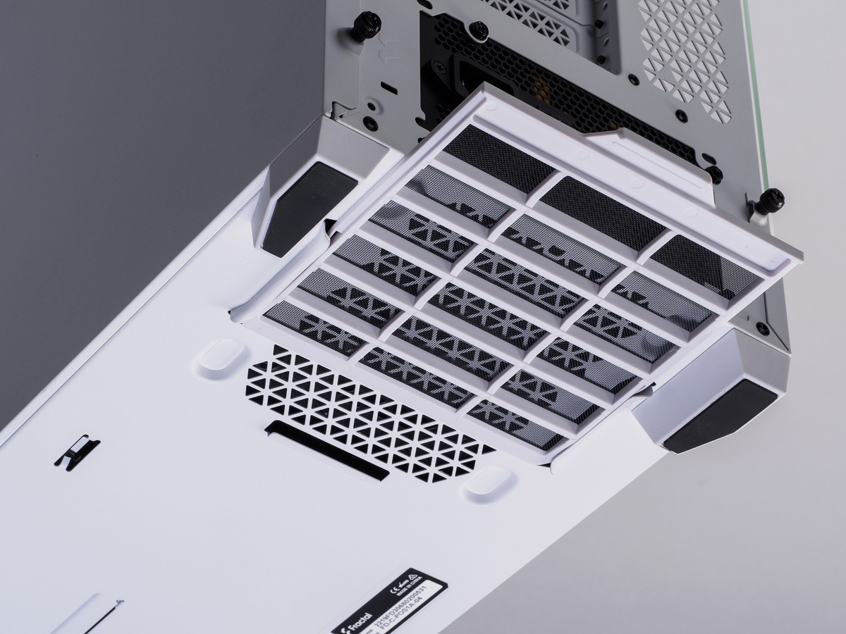 電源ユニットはカバーで隠され、PCケース内部が明確に区分けされている。この電源ユニットの吸気は底面。底面はホコリを吸い込みやすいが、脱着式フィルターでしっかりガードできる。