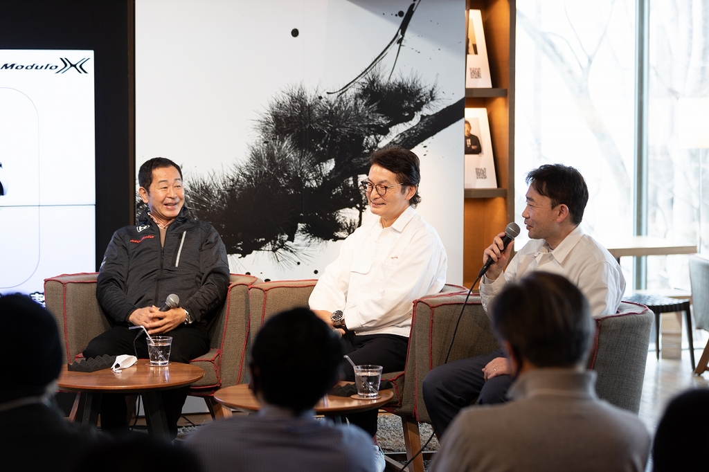 カーライフ・ジャーナリストのまるも亜希子さんを司会に、土屋さん、福田さん、湯沢さんのトークショーが行なわれました。Modulo Xが誕生した経緯や、開発の体制、開発中の裏話など興味深い話題が盛りだくさん。湯沢さんは「福田さんは、いつも“これでいいの?”って言うだけなんですよ」と不満げ。それを聞いた土屋さんは、「俺はそこまで厳しくないよ。ちゃんとコメントするよ」というと「福田さんは、何か言われるとムッとするんですよ」と茶化されたりと和気あいあいです。