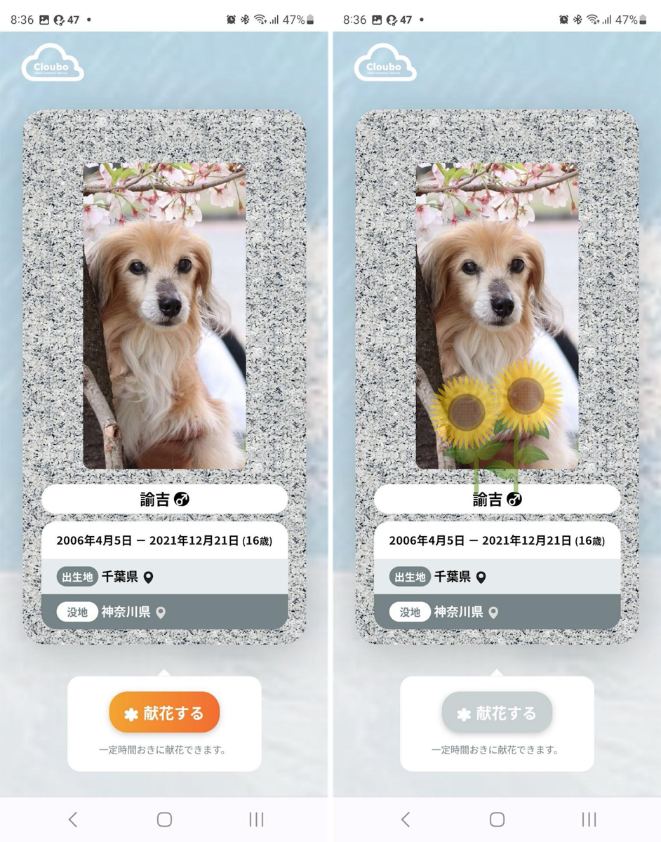 こうした編集用サイトからカスタマイズした情報が、閲覧用サイトに表示される。また、閲覧用サイトでは写真のすぐ下部に「献花する」というボタンが表示され、そこをタップすることで、写真に花が載るようなに表示される。この花は時間経過によって非表示になる。