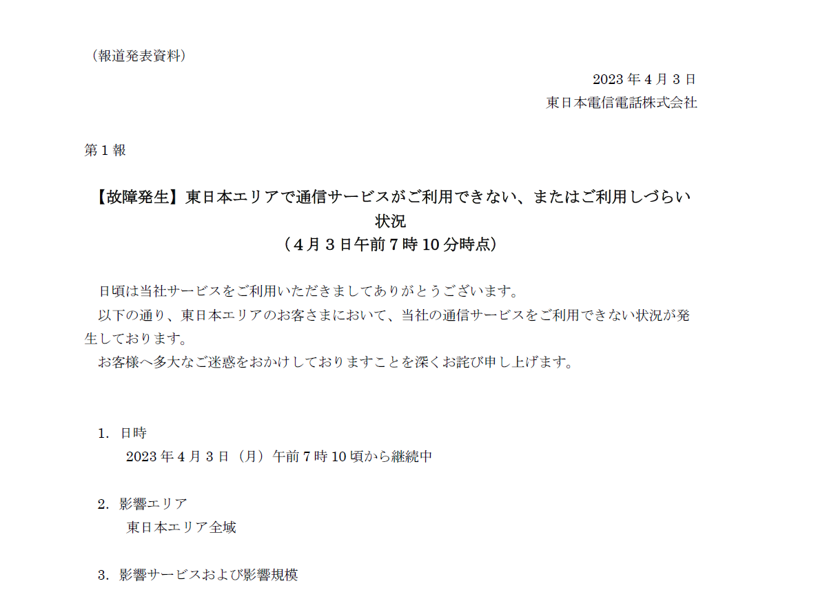 新年度を迎えた4月3日は、朝からNTT東日本・NTT西日本の通信障害により、波乱のスタートとなっている。(追記:10時30分にNTT東日本、10時40分にNTT西日本がサービスの復旧を発表した)。