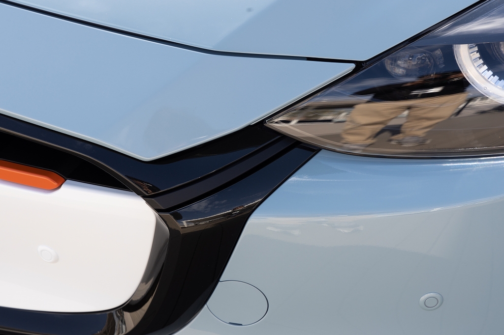 ということで、“お色直し”したMAZDA2にご対面。その瞬間、若年層代表の唯さんと、おっさんスタッフ一同は言葉を失いました。それもそのハズ、マツダのアイコンである大きなフロントグリル(シグネチャーウイング)にフタがついていたから!