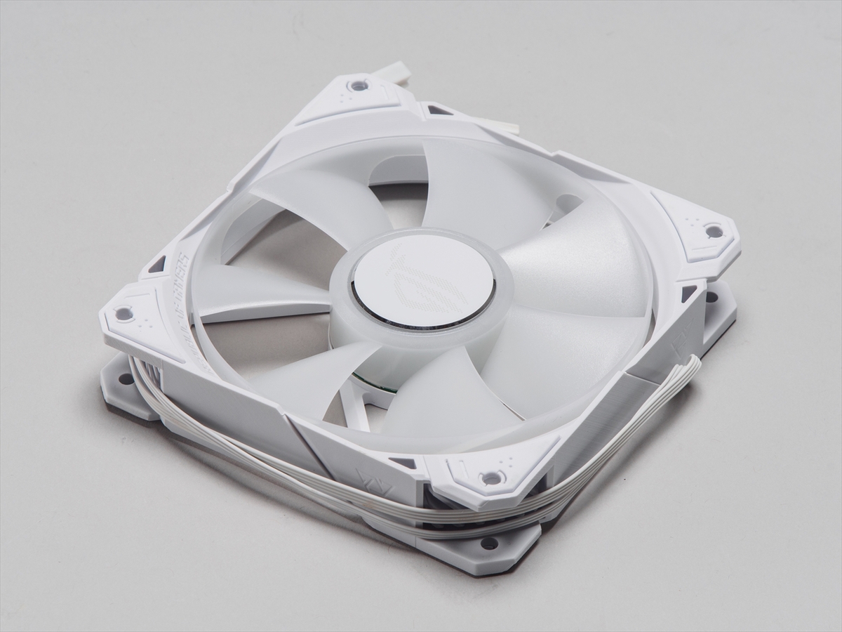 ケースファンには、「TUF GAMING TF120 WHITE ARGB」を使用した。ケースと同様のTUF GamingシリーズでARGBを備えたケースファンとなり、PWM制御に対応。回転数は250~1900rpmで設定できる。流体軸受を採用することで、最大25万時間の駆動が可能だという。