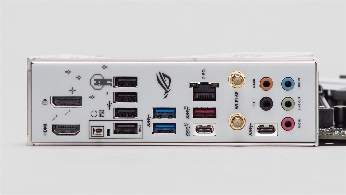 ROGらしいLEDをあしらったロゴがワンポイントとなるデザインで、ゲーミングらしい派手さはありつつ、白いパーツを最大限に活かしている。スペックとしては、パワーステージが12+1基、M.2スロットはPCI Express 4.0対応のものを2基備え、ビデオカード用のx16スロットはPCI Express 5.0に対応する。