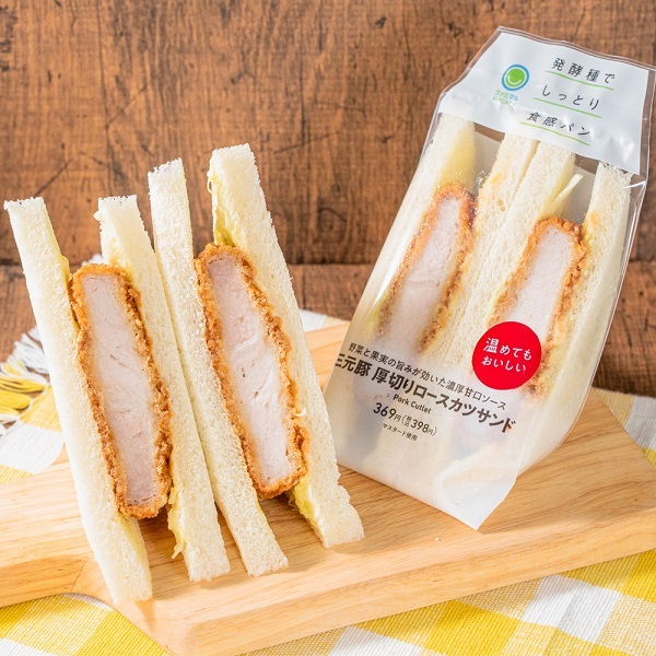 「三元豚 厚切りロースカツサンド」は、三元豚の厚みのあるロースカツをメインに、野菜と果実の旨みのある濃厚甘口ソースで仕立てた商品。具材が全体のおよそ70%と、ボリューム満点です。