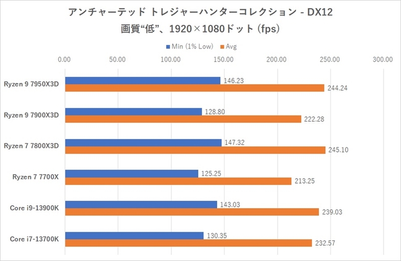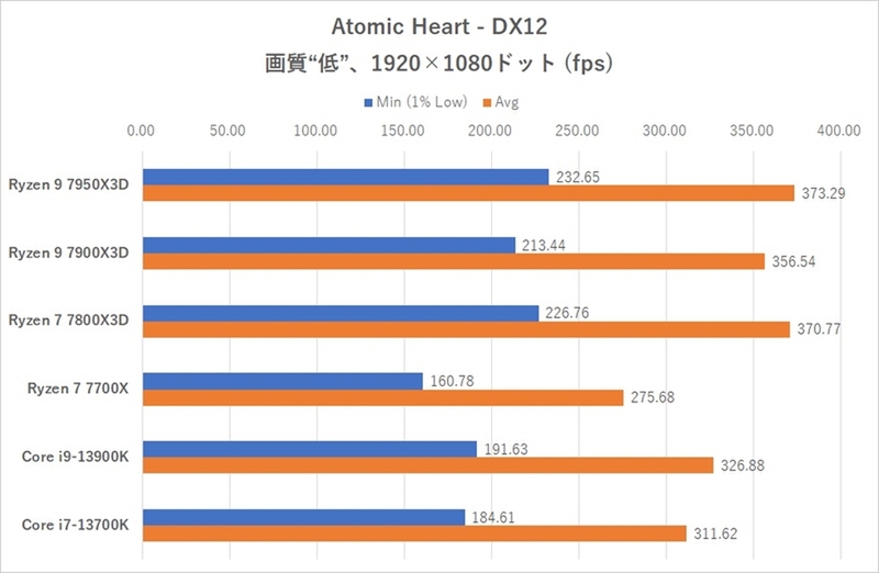 Ryzen 9 7950X3Dレビュー時はRyzen 9 7950X3DとCore i9-13900Kの差が10fps程度しかなかったが、今回500fps上限にし、さらにGPUドライバーも最適化後となったせいかしっかりとした差がついた。3D V-Cache搭載を搭載したRyzenでは最低フレームレートも高く、3D V-Cacheを持たないCPUに対ししっかりとした付加価値をつけていることが分かる。