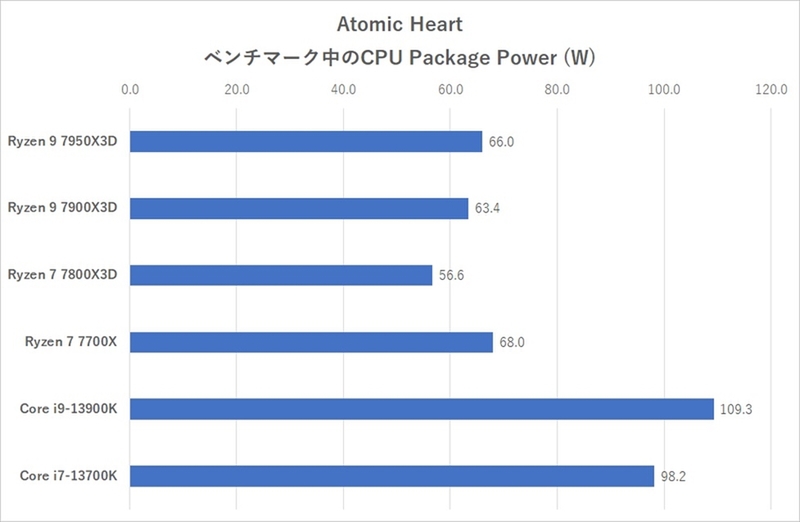 CPU負荷の高さはCPU Package Powerの高さに表れている。特にRyzen 7 7700Xはこれまでの検証ではせいぜい80W台だったが、このゲームにおいては100Wを軽く超えている。この点を考えると、フレームレートで残念な結果となったRyzen 9 7900X3Dはそれほど悪くないという評価だし、Ryzen 7 7800X3Dはもっと優れたソリューションということになる。