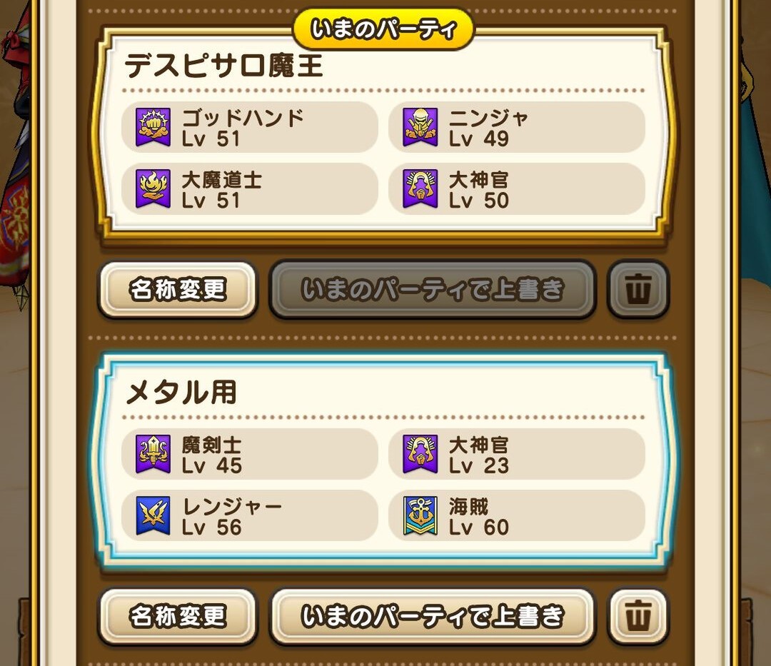 レベル上げ状況はプレイヤーごとに異なるものの、どうせなら最高の経験値効率でレベルアップしたいところ。そこで、メタル系モンスターを倒して経験値を稼ぐ「レベル上げたいパーティー」と、現状自分が組める「最高レベルパーティー」を用意しておこう。