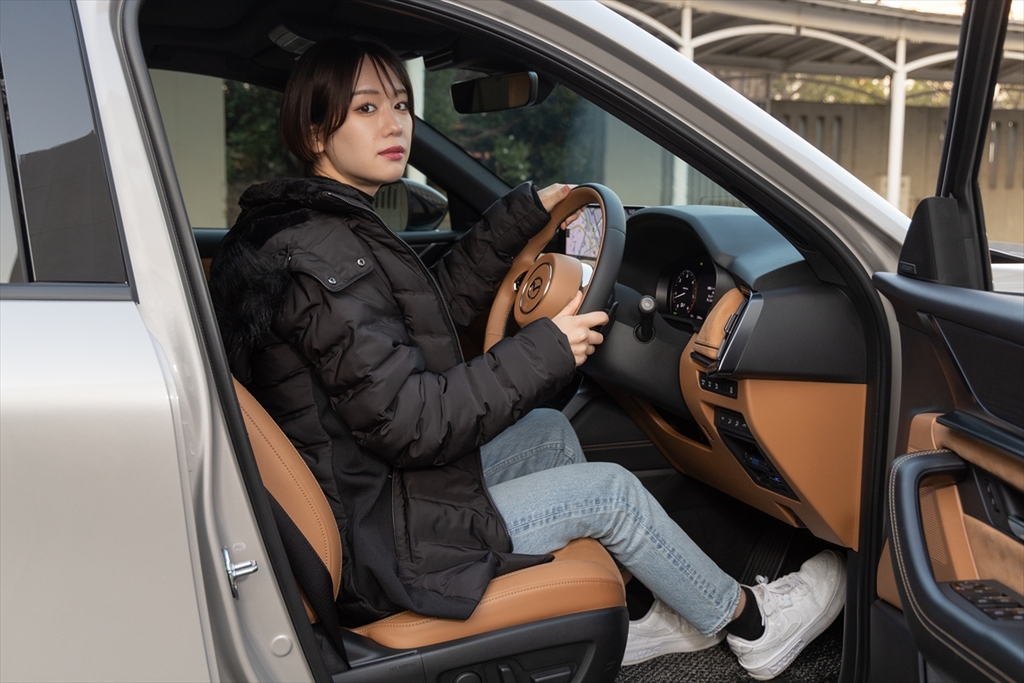 街で見かけるCX-5よりも一回り大きなCX-60。唯さんも、その大きさには驚きの表情をみせます。「フロントグリルの威圧感がスゴイですね。威風堂々といった感じがします」というように、イマドキのSUVらしいドヤ感のつよいフェイスと角ばったボディーは、ドヤ感たっぷりです。横から見ると、かなりキュービック。「コンパクトSUVに見慣れたためか、この大きさは逆に新鮮ですね。でもここまで大きいクルマ、運転できるかなぁ」とちょっと不安な表情もみせます。この辺に関しては、おそらく大丈夫。実際運転してみると、そこまで大きく感じませんから。