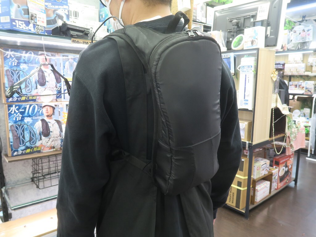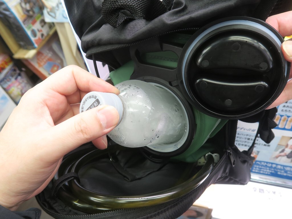 背面のタンクには2リットルの氷水が入り、環境温度から温度差-10度の冷感が得られるという。新モデルでは、氷の代わりに凍ったペットボトルをそのまま投入可能になった。