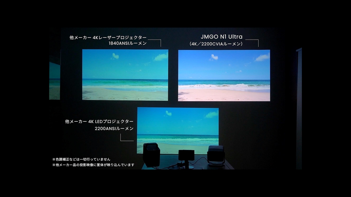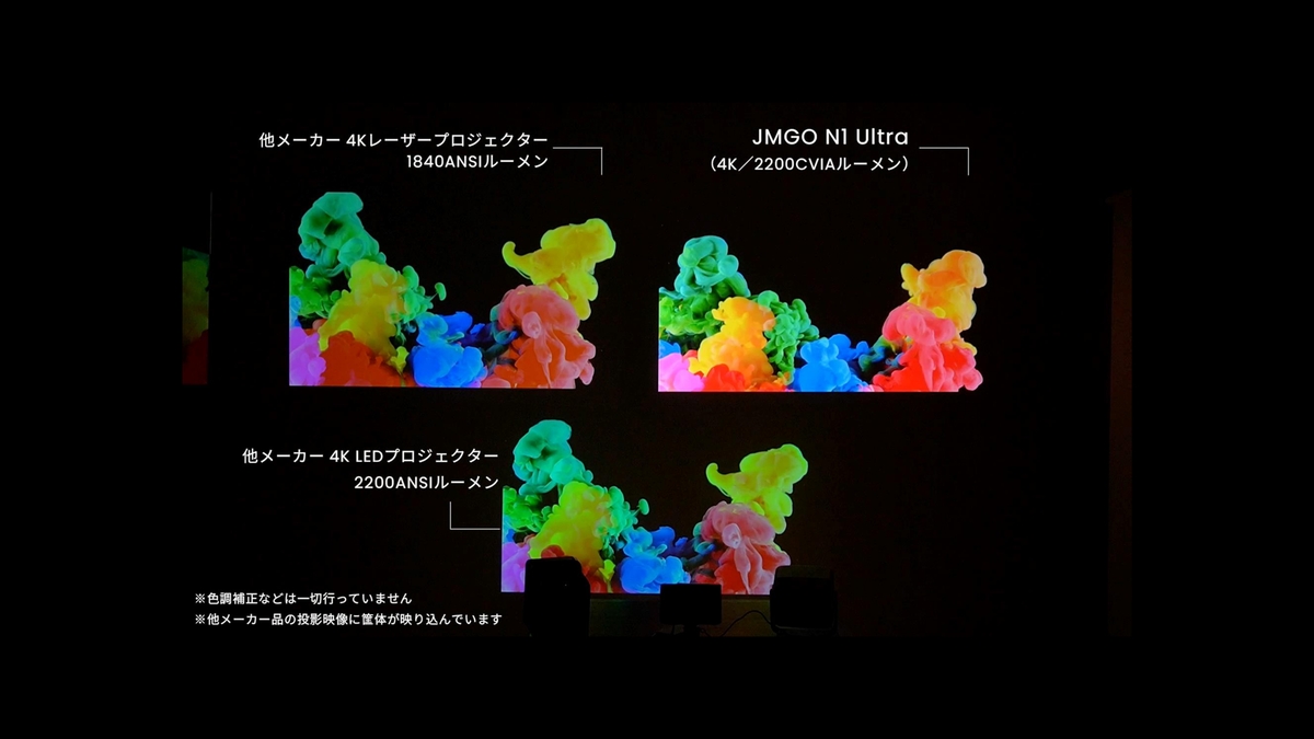 明るさは2200CVIAルーメン。CVIAは中国で策定された規格で、3200ANSIルーメンの製品よりも明るく、コントラスト比は1600:1となっている。JMGO独自の比較測定で従来品よりも鮮明な映像を出力できているという。