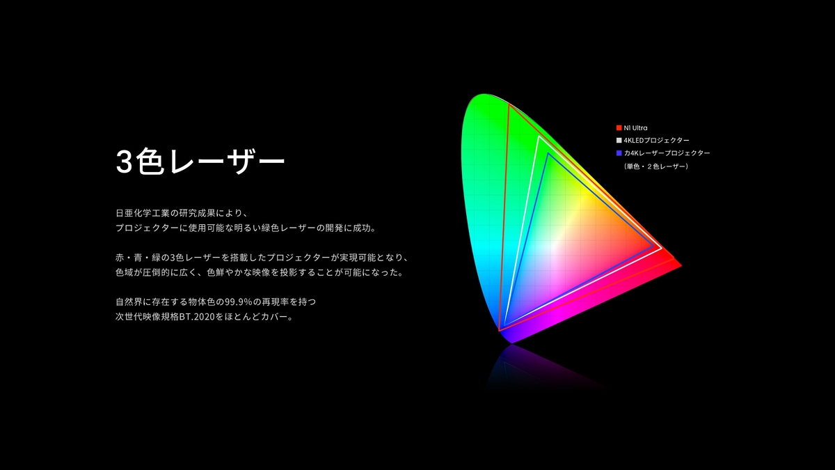下図の赤線で囲まれた部分がN1 Ultraでカバーしている色再現範囲。白線が従来の4KLEDプロジェクターの色再現範囲であり、より多くの色を再現できることがわかる。