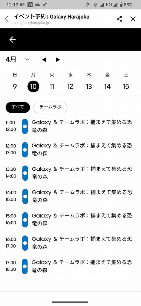 あとは自分のスマートフォンから、Galaxy HarajukuのLINEアカウントを友だちとして追加し、そこからGalaxy Harajukuのミニアプリでマイページへ移動。「Galaxy & チームラボ 捕らえて集める恐竜の森」アイコンをタップすると、QRコードの読み込み画面になるので、貸し出し端末に表示されているQRコードを読み込めば、以降はコレクション図鑑が表示されるという仕組みだ。
