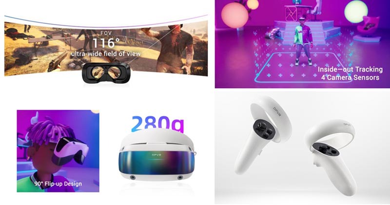 DPVR E4は、 PCに接続して使用するVRヘッドマウントディスプレー。解像度3664×1920ドット/リフレッシュレート 120Hz/視野角116度の高解像度ディスプレーを搭載し、付属のコントローラーは6DoFの動きに対応。トラッキングには、インサイドアウト方式を採用し、ベースステーション等を設置する必要がないので、よりスムーズなVR体験が可能。
