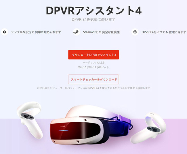 VR配信プラットフォーム「SteamVR」に対応しており、さまざまなVRコンテンツ/ゲームなどの配信タイトルを楽しめる。専用ソフト「DPVR Assistant 4」にてDPVR E4Kを一元管理可能。