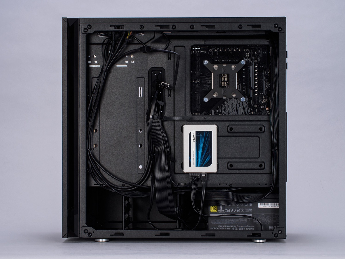 裏側を見てみると、ケーブルを無理に押し込んでいる印象はまったくなく、キレイに整理されている。取り回しの方向ごとに結束され、どのケーブルがどれにつながっているのかわかりやすくなっているため、SSDやHDDを増設する際に悩まなくていい。
